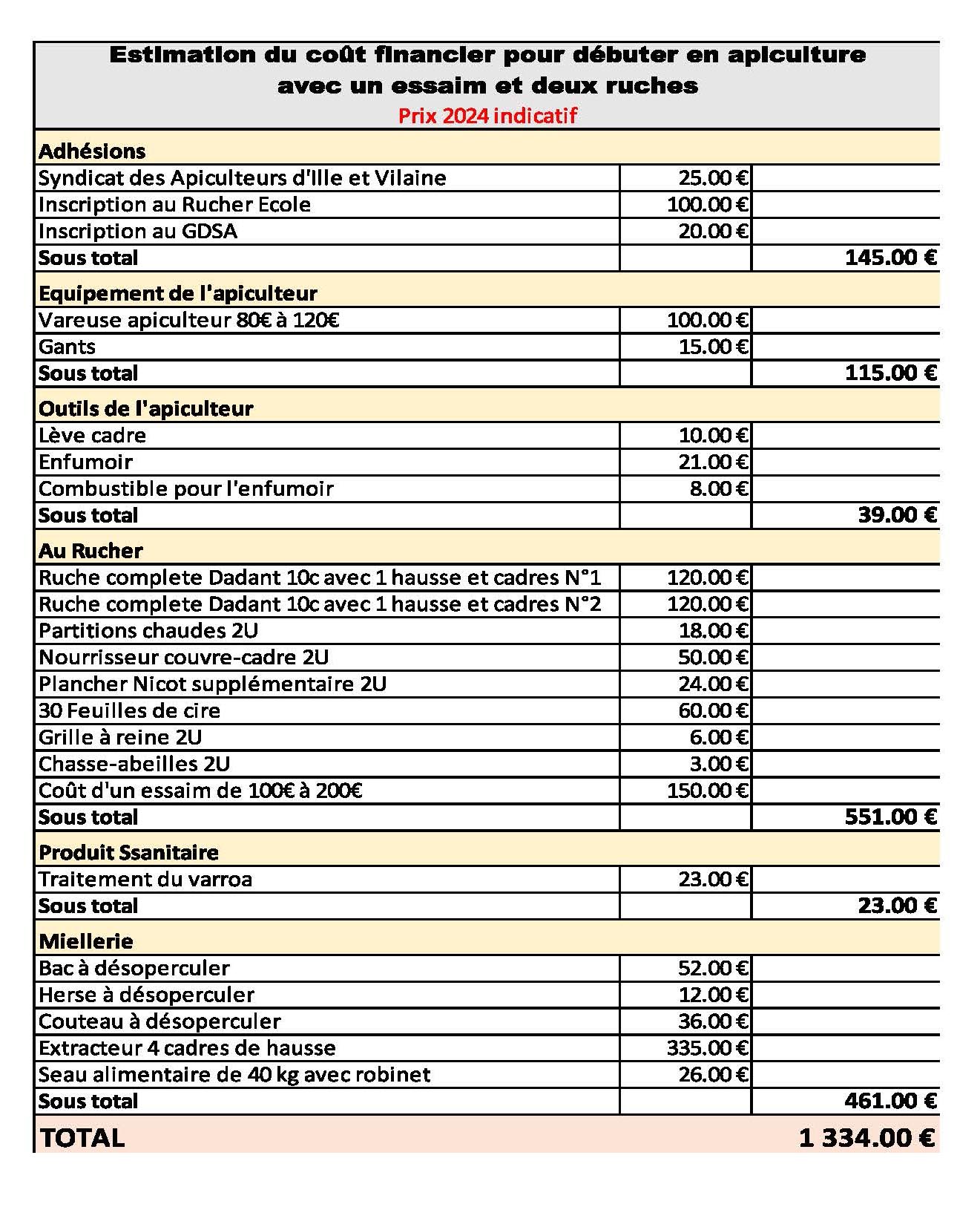 Le tableau ci-dessous donne une idée approximative de l’investissement financier nécessaire pour démarrer en apiculture (prix relevés en magasin). Pour alléger l’addition, il est bien sûr possible d’acquérir du matériel d’occasion ou de différer certains achats comme par exemple celui de la miellerie. Il y a la possibilité de louer un extracteur à moindre coût ou d’en acheter un à plusieurs. L’investissement peut être largement en dessous de 1000 euros en cas de non achat de matériel de miellerie et d’un rucher avec une ruche